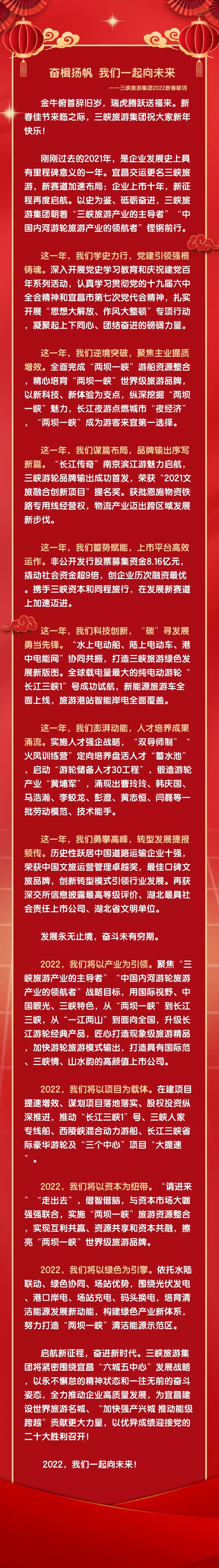 2022.03.153月6日,湖北三峽旅游集團股份有限公司第四屆職工代表大會第一次全體會議暨2022年度工作會議在長江三峽1號純電動游輪召開。會議全面 【查看全文】